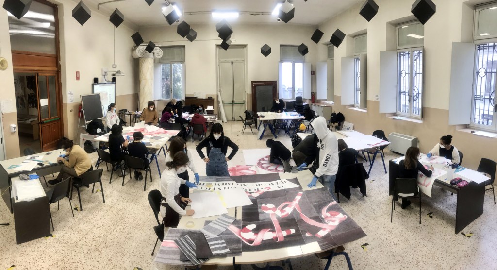 Faccio qualche passo indietro per poter ammirare per intero tutto il lavoro che questi giovani hanno svolto. Ventiquattro studenti per un’unica grande opera. Tanti tasselli suddivisi e realizzati in solitaria, a distanza, nelle proprie abitazioni. Molte ore di lezione. Tante ore di lavoro e di confronti in “classi” virtuali che ora, finalmente, trovano la piena realizzazione in un luogo fisico, in quella scatola magica che è studiodieci e, ancora una volta, devo riconoscere che il Tutto è più della somma delle sue singole parti.