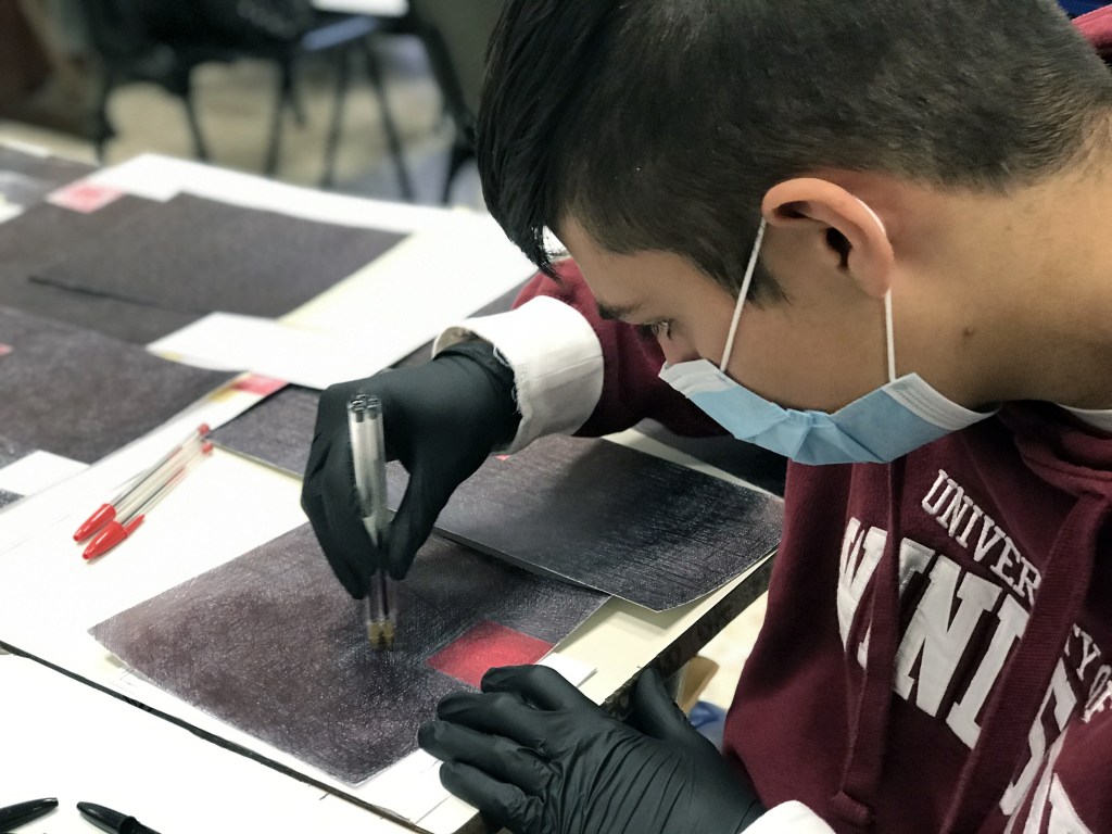 2020. Ci sarebbero molte cose da dire, ma poche da raccontare. Guardo verso il Centro Culturale e non posso non commuovermi nel contemplare un’unica grande opera grafica suddivisa nelle cinque vetrine, per un totale di quasi dieci metri per due di superficie cartacea trattata con comuni penne a sfera. Carta e Penna. D’altronde è un lavoro scolastico quello che i giovani allievi hanno realizzato. Due strumenti: i più semplici, i più comuni; quelli che contraddistinguo, dapprima, il tempo dell’apprendimento e, successivamente, la necessità di esternare, di esprimere e di lasciare una memoria. Forse è vero che questi ragazzi hanno poche esperienze adolescenziali da raccontare, riferendosi a questo anno anomalo, il 2020; ma da quello che vedo, invece, sono stati capaci di realizzare un’opera in grado di esporre il loro punto di vista sulle imminenti festività natalizie in questo tempo che, purtroppo, ha poco da festeggiare, ma molto da testimoniare.