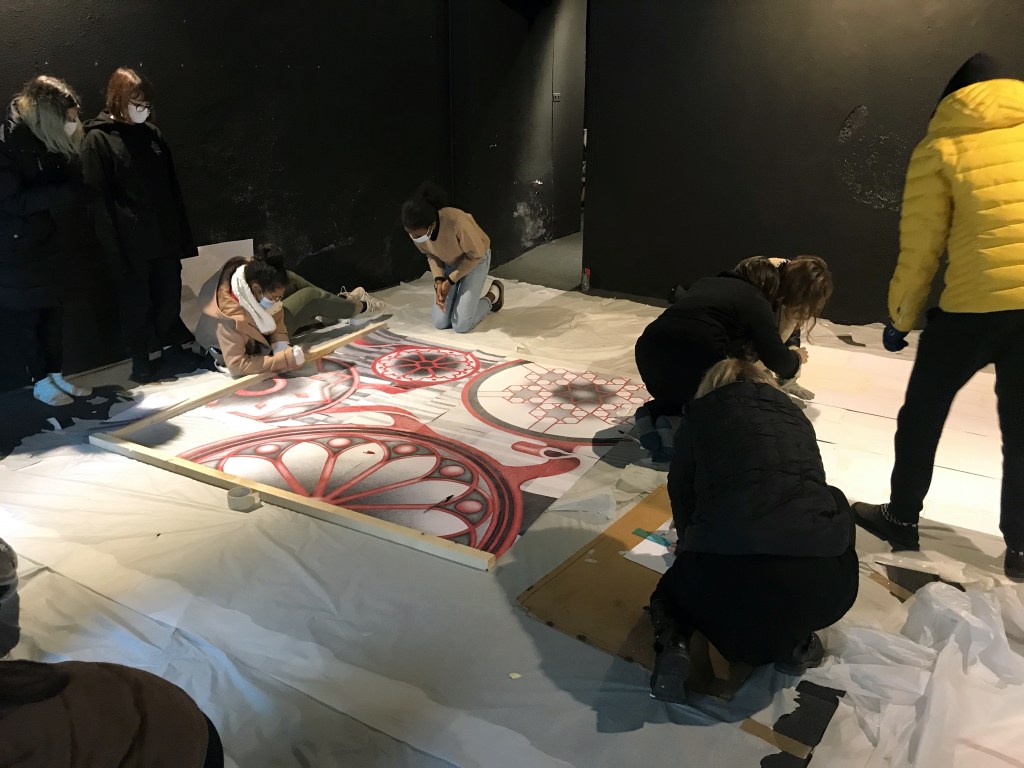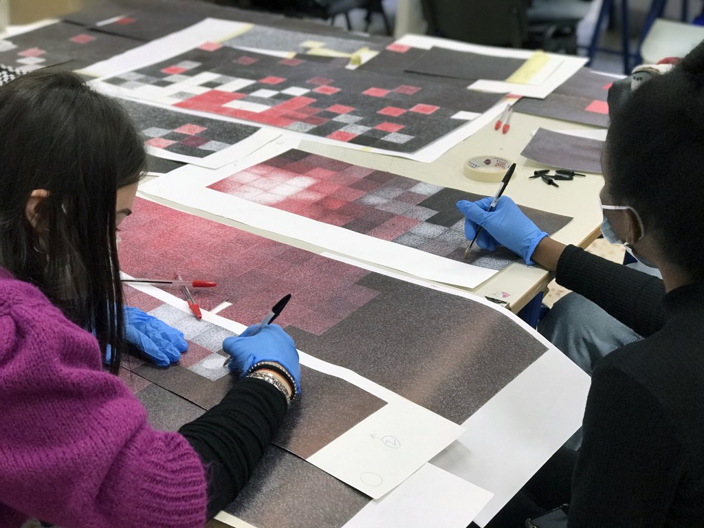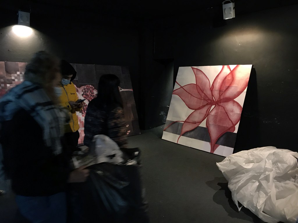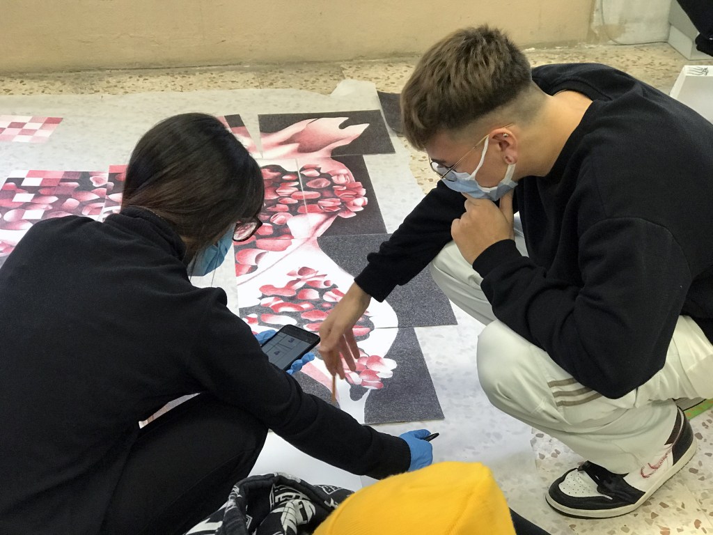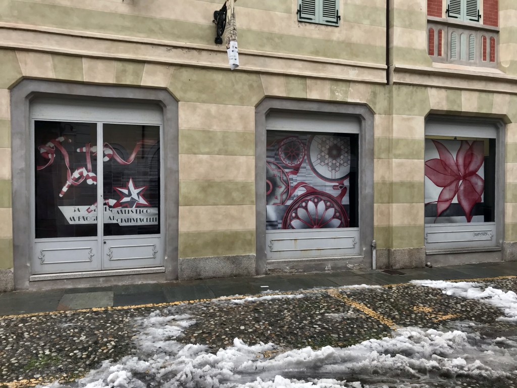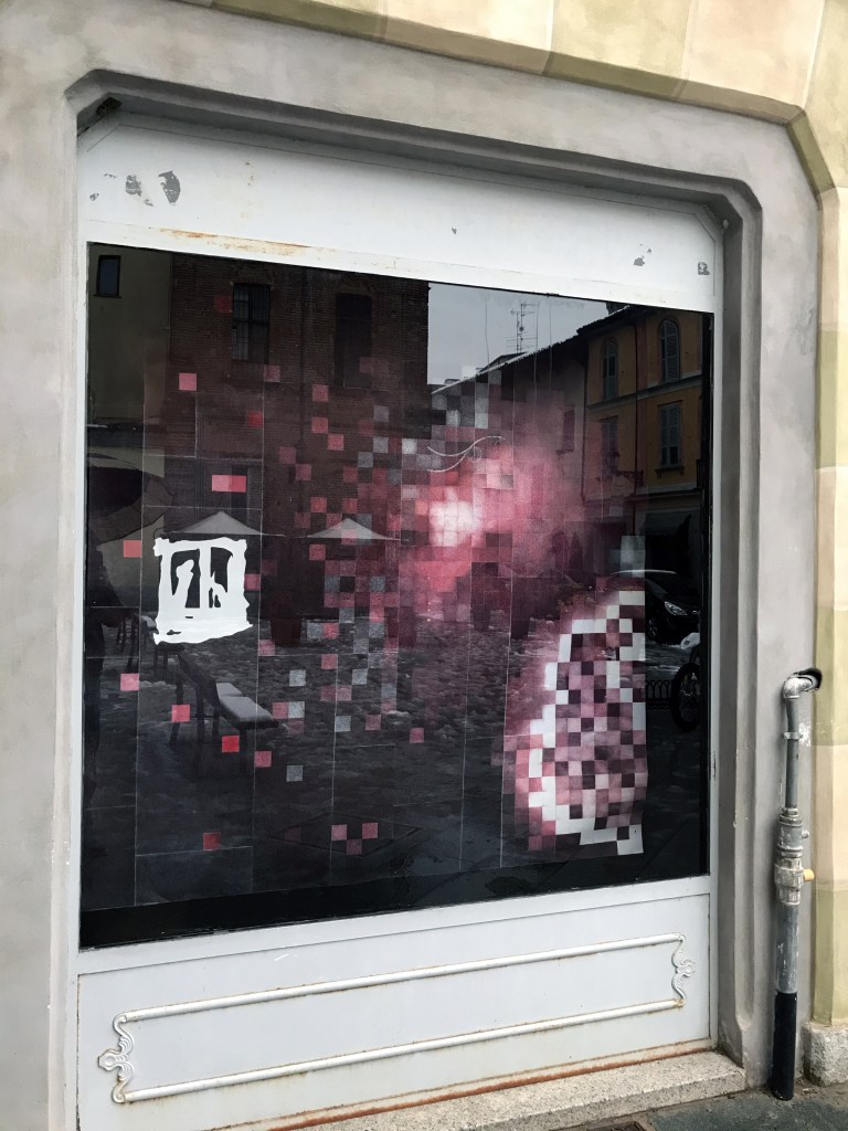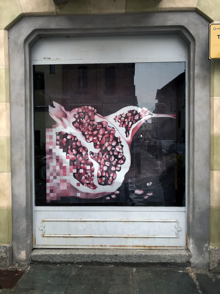 Ho sempre bisogno di nuovo ossigeno e di bellezza, ed è per questo che ho proposto a dei giovani studenti di invadere quello spazio di cortina culturale visibile soltanto attraverso un vetro, affinché potessero descrivere questo momento che, anche loro, stanno osservando a distanza, senza viverlo appieno. Per questo l’opera si apre con un’immagine sfocata, frammentata, “sgranata” in tutti quei pixel che la realtà virtuale mi ha abituato a conoscere: bassa risoluzione o bassa qualità? È ancora presto per dirlo, quindi chiedo un ulteriore sforzo ai miei occhi e cerco di decifrare quello che questi ragazzi stanno cercando di dirmi. Il nero di fondo sembra far da padrone e tonalità di rosso mi invitano a cercare più attentamente tra quelle forme. È quasi Natale, il solstizio d’inverno è alle porte e, tra quelle scomposizioni, emergono tre melagrane che vogliono ricordarmelo, grazie al loro significato simbolico che attraversa culture ed epoche differenti. Quale messaggio stanno cercando di trasmettermi questi studenti? Uno dei frutti è rappresentato aperto e ho modo di ammirarne l’interno, perché è evidente che è nella sua struttura che devo ricercare per andare avanti e riuscire a decifrare l’articolata composizione di quest’opera. Tutti i grani sono collegati fra di loro, uniti all’interno di un frutto dalla forma sferica, perciò è evidente il rimando all’insieme dei singoli individui sparsi su tutta la superficie della terra e che il concetto di “Io” è possibile grazie al “Noi” dal quale deriva. Una consequenzialità che, introdotta da un nastro rosso, mi invita a proseguire e mi fa da guida all’interno di questo nero fondale; da Piazzetta Pugliese Levi, giro l’angolo verso via Verdi. Voglio scoprire cosa, questa linea scarlatta, vuole farmi incontrare. Ed ecco scendere dall’alto delle caramelle, tipiche del periodo natalizio, bastoncini di zucchero che mi ricordano la gioia che provavo da bambino in questo periodo dell’anno. Sorrido e penso che, probabilmente, è proprio questa l’intenzionalità di questa rappresentazione, ma immediatamente scorgo un taglio diagonale che attraversa la composizione sfalsandola, riportandomi ad una più dura realtà. Raccolgo un po’ di dolcezza…il cuore, spesso, ne ha bisogno.