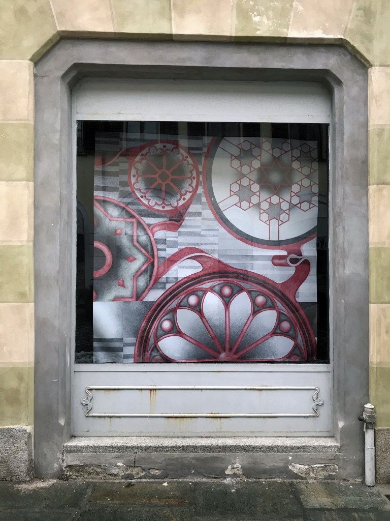 Incontro una stella, ma non brilla in cielo e non è una cometa. La osservo. La conosco. La riconosco e sempre scivolando su quel nastro rosso mi sposto nella vetrina successiva. Quell’astro è lo stesso collocato sopra l’obelisco in piazza Sant’Eusebio, di fronte al Duomo cittadino. Ritrovo anche alcuni frammenti dei rosoni principali dell’Abbazia di Sant’Andrea e della Sinagoga di Vercelli. Forse inizio a comprendere questo puzzle simbolico e il percorso svolto. Il nero della porta solstiziale che ha fatto da sfondo alle vetrine precedenti, ora, si sta schiarendo grazie ad una luce che tenta di disperdere quelle tenebre. Tutti quei grani della melagrana sono l’umanità intera e quel filo rosso il tempo che sta vivendo; tempo che ha subito un arresto, un di-stacco, ma soffermandomi sui particolari, capisco che questi ragazzi vogliono prendere una distanza dai pixel delle prime immagini, in favore di una maggiore adesione con la realtà, una traslazione che dal virtuale mi riporta alle radici culturali, alla storia e a quella bellezza che, solo l’arte, in ogni epoca, è stata in grado di portare ai massimi livelli. Il filo rosso, però, non ha ancora terminato il suo compito e mi invita a guardare oltre, verso l’ultima vetrina di studiodieci dove incontro altri nastri che, a loro volta, si incontrano, si intrecciano gli uni agli altri fino a comporre un grosso fiore scarlatto. Il fondo bianco mi dice che devo solo avere pazienza, che primavera è vicina e che arriverà il tempo per un nuovo Tempo.