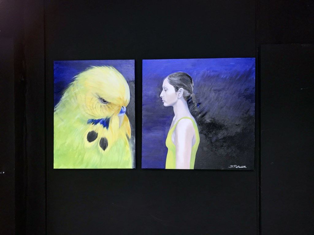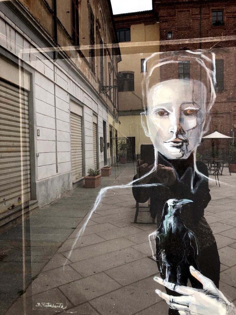 Ripenso alla volta in cui ho creduto di morire in un bagno di una Crêperie, durante uno degli attentati che hanno segnato la Francia e, nonostante questo, non riesco ad immedesimarmi in quei giovani che quella lontana sera di un novembre si erano ritrovati al Bataclan. Ecco così che la prima vetrina di S10 diviene ancora più cupa del nero che già domina in tutto lo spazio. Una donna. Un corvo. Figure lontane. Silenzio. Inquietudine. Il segno grafico utilizzato da Pietrasanta in questo quadro diventa quasi un filo che delinea i soggetti e li lega gli un agli altri. Non vi è via di scampo, per questo l’immagine è magnetica, coraggiosa per la scelta del tema, perché saper guardare avanti, richiede l’esser stato in grado di aver guardato bene indietro.